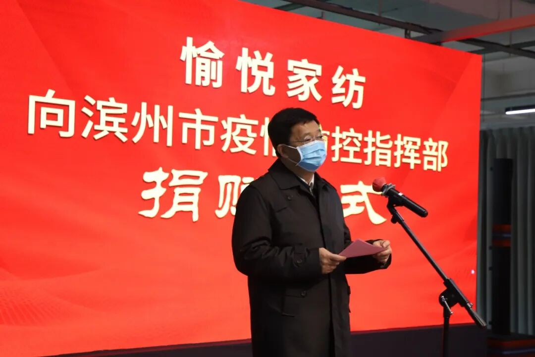市委书记、市人大常委会主任佘春明出席捐赠仪式并致辞;市委常委、秘书长张延廷主持仪式;愉悦家纺党委书记、董事长刘曰兴代表公司捐赠防疫物资,市委常委、常务副市长张宝亮代表指挥部接受捐赠。