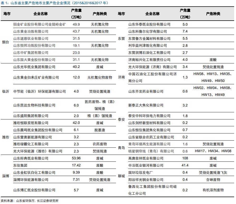 山东省产生大量的无机氰化物(HW33),属于剧毒性危废,主要由黄金生产过程中产生(原生金矿渣与氰离子络合,降低金的氧化电位,在碱性条件下被空气中的O2氧化生成金酸盐而溶解,将金从矿渣中分离出来,再用锌把金从溶液中还原),主要分布在烟台、临沂2市,特别是烟台,有玲珑(原招远金矿)、三山岛、夏甸、新城等全国排名前十的金矿。 此外,山东省聚集了大量的造纸企业(晨鸣、华泰、博汇等),国内目前纸浆制造采用碱法(烧碱法和硫酸盐法)为主,1吨化学浆将消耗300kg的烧碱,产生大量的造纸黑液(废碱,HW35)。