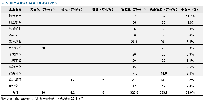 山东省拿证企业中top10市占率达到54.8%,前10大危废处理企业中4家(招金集团、招金矿业、泉林纸业、巨化股份)为产废企业旗下单位,可见山东省产废单位自行处置及利用较多,top10企业掌握的无害化资质达30.2万吨,占全省无害化资质的38%,而掌握的资源化资质占比62%;前几大处置企业如下: