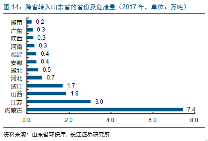 2017年转入山东危废达17万吨,主要来自内蒙古(7.4万吨,主要是煤焦油(HW11)转入华东九鼎油业&日照锦昌固废&熙源石化3家公司)、江苏(3万吨,主要是煤焦油(HW11)转入华东九鼎油业&日照锦昌固废&熙源石化&鲁岳化工4家公司),两地转入山东10.4万吨,占转入量的61%。
