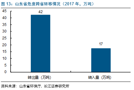 山东省每年都会大量的危废通过跨省转出进行处理,2017年转出量42万吨。从接收的省份来看,江苏(主要是江苏新春兴再生接收大量的废铅酸蓄电池转入)、安徽(太和县接收大量的废铅酸蓄电池转入)接受较大量的废物,但安徽省厅从2017年底出台收紧危废的跨省转入的政策,对山东省的危废处理形成一定冲击。